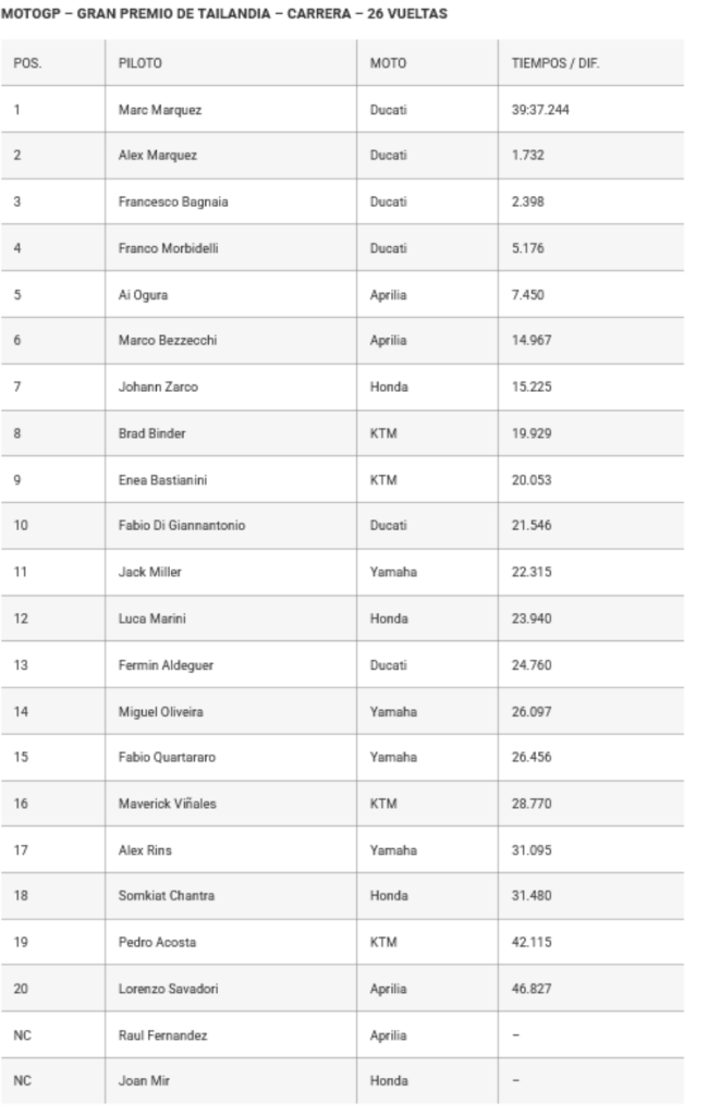 Con respecto a Álex se mostró sólido y también como un fuerte rival tanto para Marc como para el compañero de este, el italiano Francesco Bagnaia, a quien superó en todas las sesiones y lo relegó al tercer puesto tanto en el Sprint como este domingo en el GP, tras arribar a más de dos segundos del mayor de los hermanos españoles.