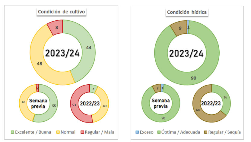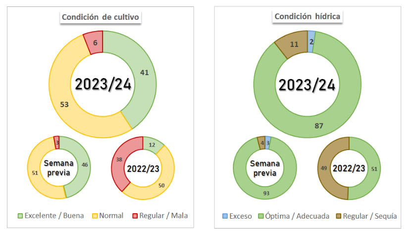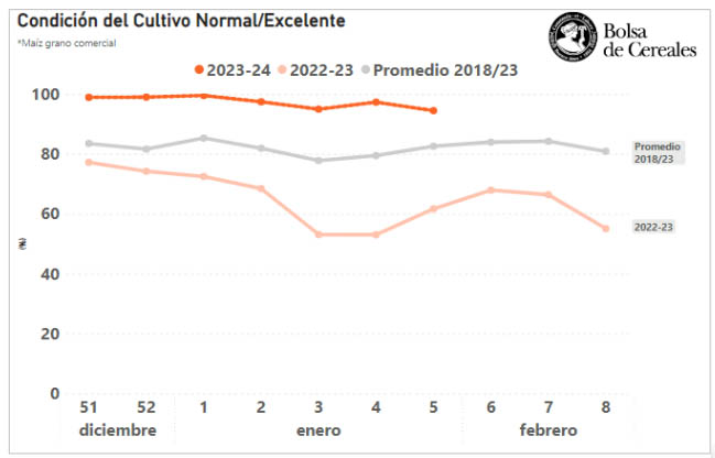 El 92% de los cuadros de soja a nivel nacional reflejan una condición de cultivo normal/excelente. En el caso del maíz, sube hasta el 94%. Se esperan producciones cercanas a los 110 millones de toneladas entre ambos cultivos.