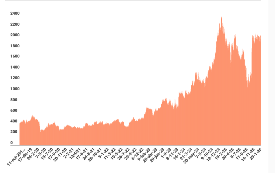 “El precio del oro alcanzó un máximo histórico durante la jornada de este lunes, impulsado principalmente por el aumento de las tensiones geopolíticas y la creciente presión política sobre la Reserva Federal. En este contexto, el metal precioso se comercializa por primera vez en el nivel de USD 5.000 por onza”, explicó Damián Vlassich, team lead de Estrategias de Inversión en IOL Inversiones.