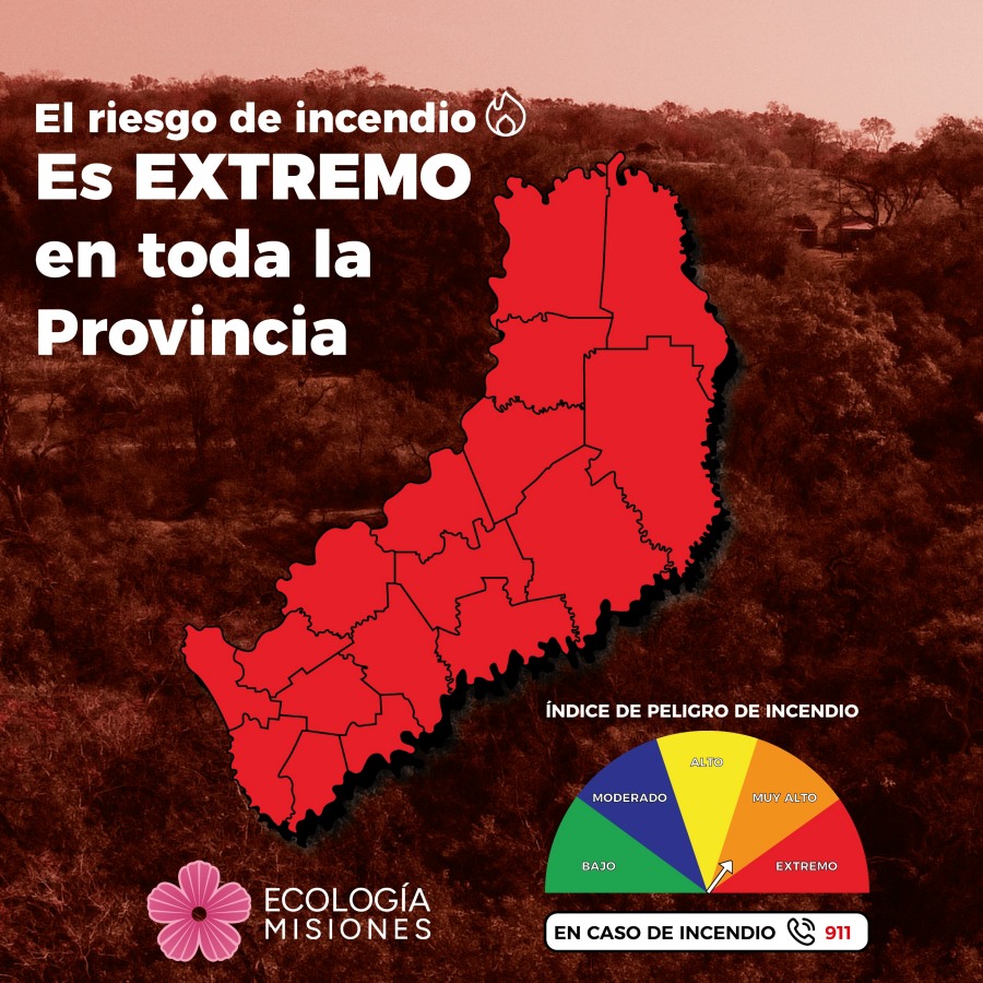 El Gobierno de la provincia de Misiones advierte que el índice de peligrosidad de incendios es extremo en toda la provincia. Esta situación no solo pone en peligro su biodiversidad, sino también afecta gravemente al turismo, una de las principales actividades económicas de la provincia. En ese marco, se recuerda a la ciudadanía la vigencia de la Ley N° 26.815 de Manejo del Fuego, que establece un marco legal claro para prevenir y sancionar las actividades que contribuyen a los incendios forestales en Argentina.