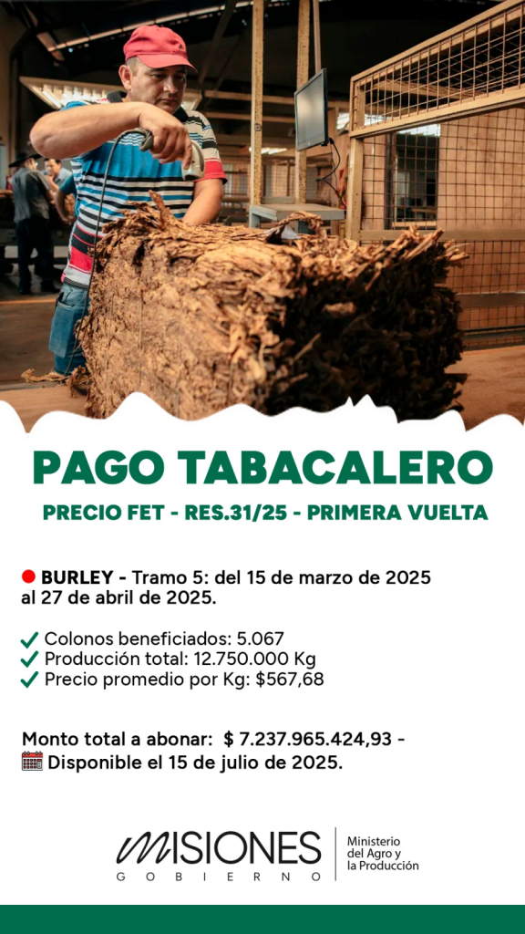 desde la cartera agraria de la provincia de Misiones informó que el próximo día 15 de Julio estará disponible el pago correspondiente al Tramo 5 de la producción de tabaco tipo Burley, acopiado entre el 15 de Marzo y el 27 de Abril de 2025, según lo establece la Resolución 31/25 del Fondo Especial del Tabaco (FET).