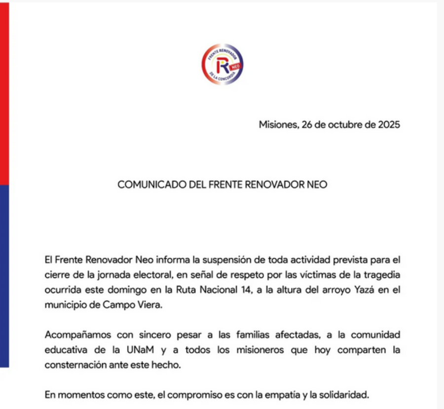 El Frente Renovador Neo informó este domingo la suspensión de todas las actividades previstas para el cierre de la jornada electoral, en señal de respeto por las víctimas del trágico accidente ocurrido en la Ruta Nacional N° 14, a la altura del Arroyo Yazá, en el Municipio misionero de Campo Viera.