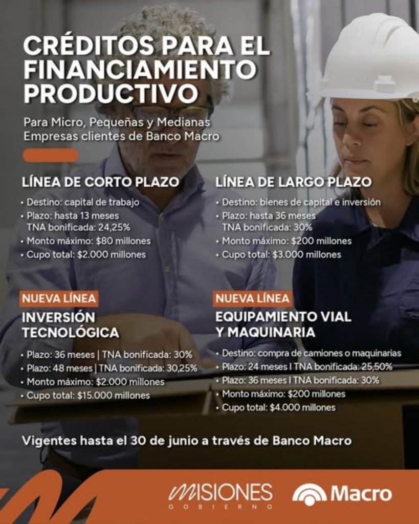 Estas herramientas estarán vigentes hasta el 30 de Junio y ya se encuentran disponibles a través de Banco Macro, entidad encargada de gestionar los fondos y la asistencia a las empresas que deseen acceder. Los interesados podrán aplicar en cualquier sucursal consultando por las líneas de financiamiento productivo con tasa bonificada por el Gobierno de la provincia de Misiones.