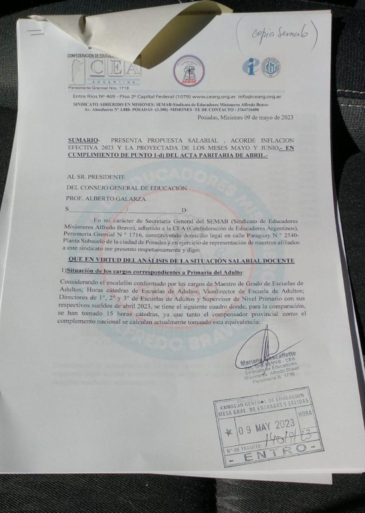 El escrito firmado por la Secretaria General del SEMAB-CEA, Mariana Lescaffette, está dirigido al Ministro de Educación Miguel Sedoff y Organizaciones Sindicales integrantes de la Mesa de Diálogo que define los salarios de los educadores en la provincia de Misiones.