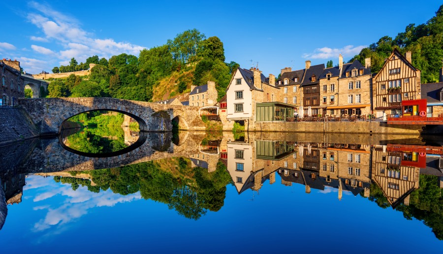 The Old stone bridge and historical medieval houses reflecting in La Rance river in Dinan town port, Brittany, France