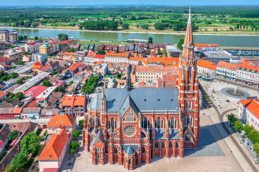 Aerial view of the Church of St Peter and St Paul, the co-cathedral of the Roman Catholic Archdiocese of Đakovo-Osijek, is a neo-Gothic sacral structure built in 1898, located in Osijek, Osijek-Baranja county, Slavonia region of Croatia.