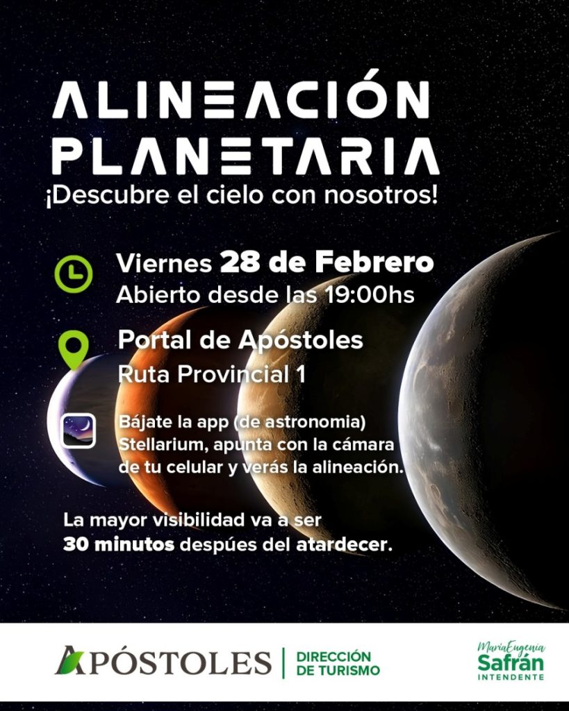 La ciudad misionera de de Apóstoles se prepara para presenciar un evento astronómico único. La alineación planetaria de 7 planetas. El evento, que se producirá hoy a partir de las 19,00 horas, puede ser observado desde el Portal de Ingreso a la ciudad.