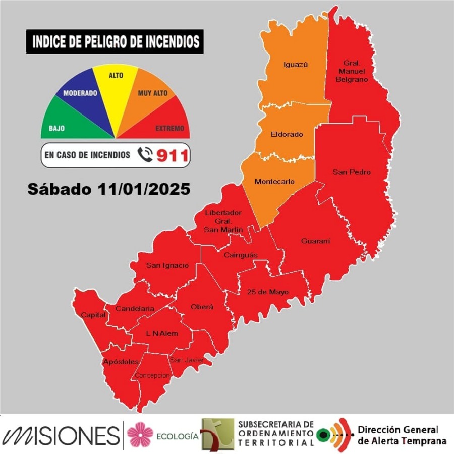 La provincia de Misiones se mantiene en alerta roja debido al riesgo extremo de incendios, que afecta a gran parte del territorio. En caso de detectar columnas de humo o llamas, la población debe comunicarse al 911 o al 105 (Emergencia Ambiental), 100 (Bomberos) o 103 (Defensa Civil).