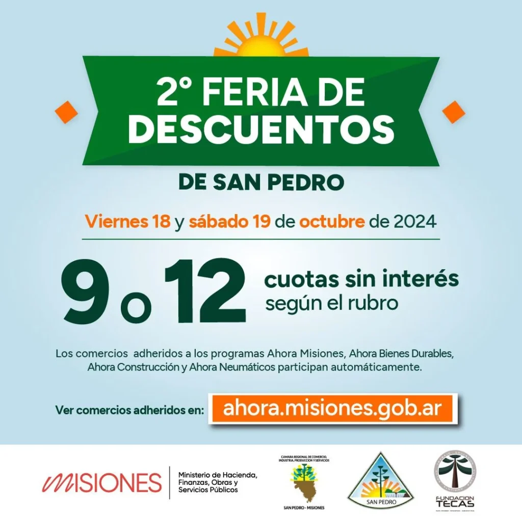 Luego de los buenos resultados generados durante la primera edición del evento realizada en 2023, los próximos viernes 18 y sábado 19 de octubre estará vigente la segunda edición de la Feria de Descuentos de la localidad de San Pedro, un evento comercial que permitirá a los comercios ofrecer hasta 12 o 9 cuotas sin interés de acuerdo a su rubro. Durante los días de la promoción, los comercios participantes también ofrecerán importantes descuentos en el mostrador.