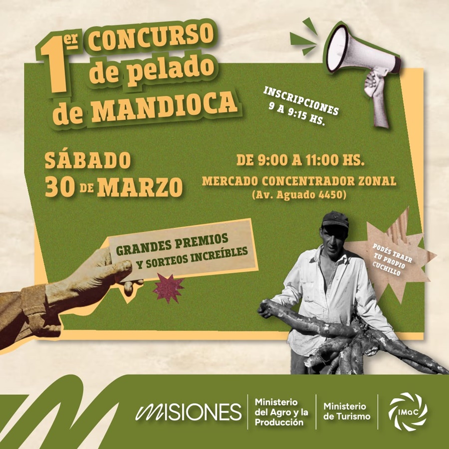 Este sábado 30 de Marzo se llevará adelante el Primer Concurso de Pelado de Mandioca en el Mercado Concentrador de la ciudad misionera de Posadas a partir de las 9,00 hasta las 11,00 horas. El evento está organizado por los Ministerios del; Agro, de Turismo y el IMAC de la provincia de Misiones, y tiene grandes premios para los participantes.