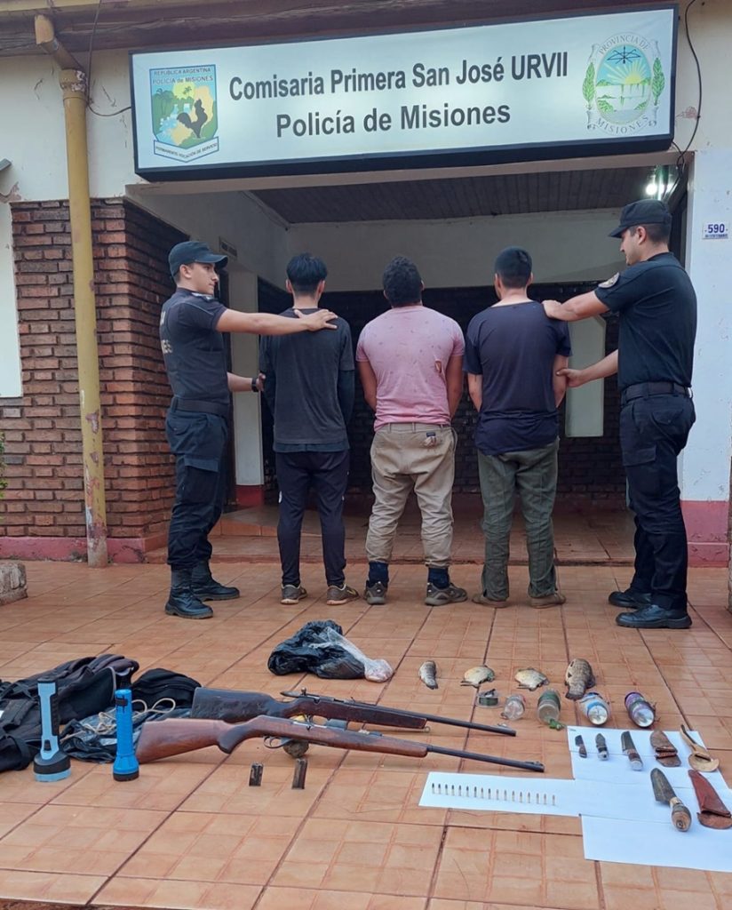 Se procedió a la aprehensión de tres individuos de entre 19 y 26 años de edad, con domicilio en el Paraje Pindapoy de la localidad se San José, como así también al secuestro de un rifle automático, marca "Rubiextra", calibre 22 largo, con cartuchos; un rifle semiautomático marca "Super Daina" cal. 22 largo, con cafgador y cartuchos; cuatro cuchillos de fabricación artesanal con vainas; dos mochilas conteniendo líneadas de mano varias y pescados especies "Pacú" y "Tararira".