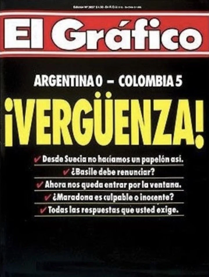La tapa de El Gráfico tras el 0-5 de Argentina ante Colombia, el 5 de septiembre de 1993 en el Monumental.