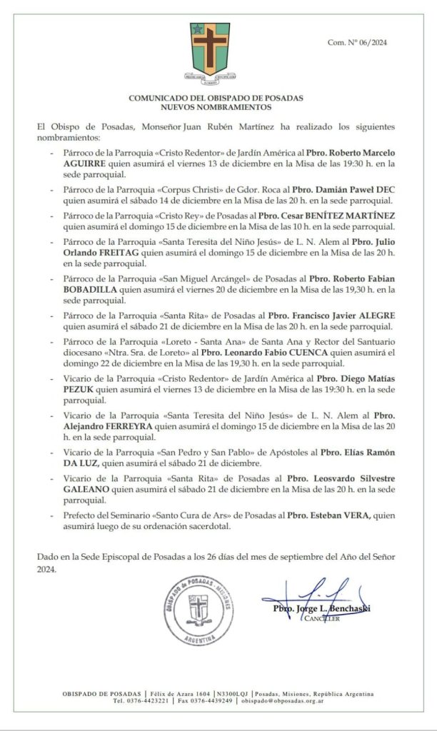 Este comunicado oficial fue emitido el 26 de Septiembre de 2024 por el Pbro. Jorge L. Benchaski, Canciller del Obispado de la ciudad de Posadas.