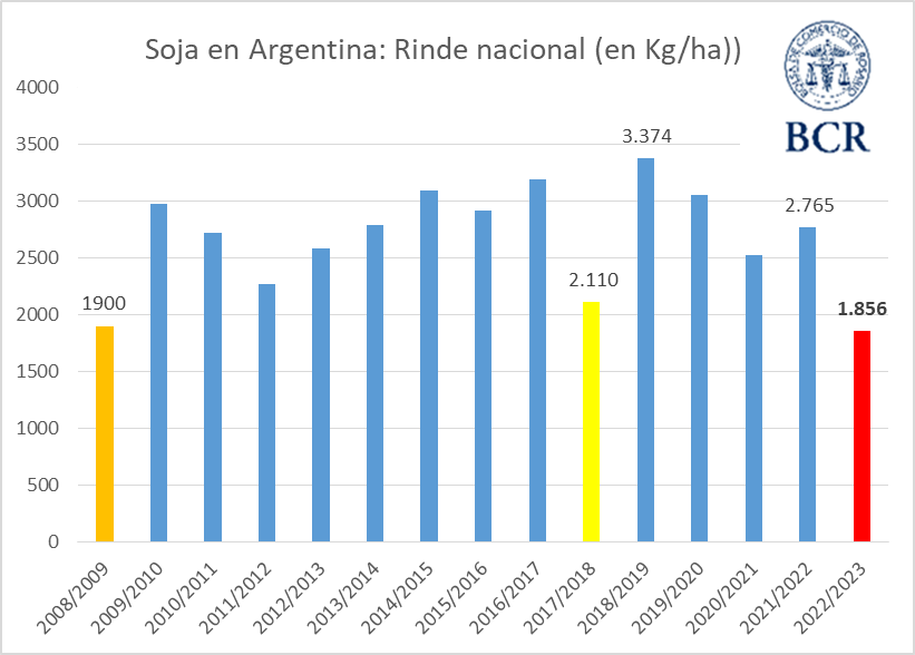 En soja, la pérdida de área pasó de estimarse en 2,68 a principios de Marzo a 3,58 M de hectáreas. Los rindes se han desplomado al limitarse aún más el número de granos por metro cuadrado y al afectarse drásticamente el peso de granos. De esta manera se estima en Abril un rinde nacional de soja de 18,6 qq/ha (vs 20,3 en marzo). Este es el más bajo de los últimos 15 ciclos productivos de Argentina, quedando incluso por debajo de los 19 qq/ha de la 2008/09.