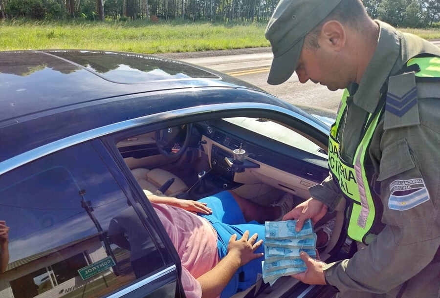 Personal que se encontraba apostado a la altura del Paraje Filadelfia detuvo la marcha de un automóvil ocupado por dos personas, una de ellas menor de edad, quien presentaba un gran bulto de forma rectangular en uno de sus bolsillos. Al ser consultados sobre el mismo, quien se encontraba conduciendo expresó que se trataba de dinero en efectivo, son contar con ningún comprobante que justifique su legal tenencia. Tal situación motivó a inspeccionar el resto del vehículo, hallando distintos fajos de dinero distribuidos en compartimientos del habitáculo y prendas de vestir ubicadas en el asiento trasero.