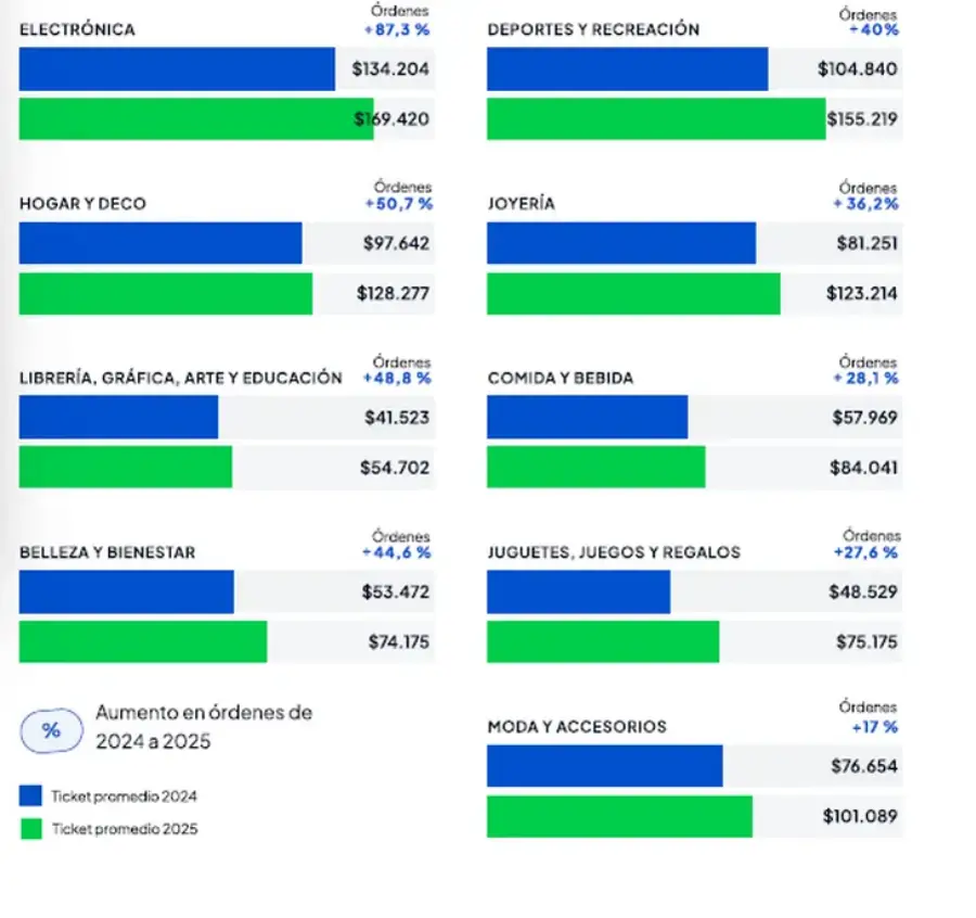 Según datos preliminares de la Cámara Argentina de Comercio Electrónico (CACE), incluidos en un informe exclusivo al que accedió Ámbito elaborado por Tiendanube (una de las principales plataformas de e-commerce del país con fuerte presencia regional) la facturación del sector creció más de 60% interanual en 2025. Las unidades vendidas aumentaron más de 28% y el ticket promedio alcanzó los $143.128, lo que representa una suba del 55% frente a 2024.