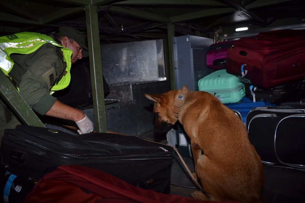Durante el control, procedieron a inspeccionar el sector de la bodega del transporte de pasajeros con apoyo del binomio conformado por un efectivo de la fuerza y un can detector de narcóticos el cual reaccionó como lo hace habitualmente ante la presencia de estupefacientes sobre dos valijas. En consecuencia, en presencia de testigos los Uniformados procedieron a apartar las dos valijas de los demás equipajes que se encontraban en la bodega.