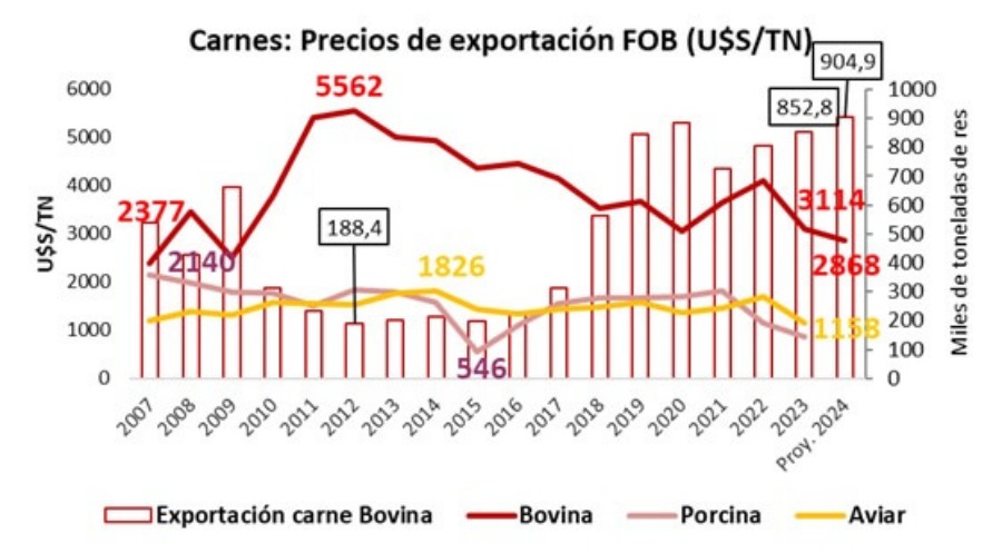 De acuerdo a un informe elaborado por la analista en mercados Marianela De Emilio y publicado por SDS, entre 2012 y 2024, los precios de exportación de carne vacuna argentina pasaron de un máximo de 5.562 dólares por tonelada a valores cercanos a 2.868 dólares.
