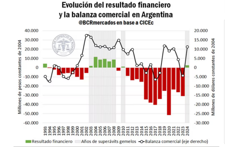 Según datos recopilados por el Centro de Investigación del Ciclo Económico (CICEc), en 2024 Argentina alcanzó superávits gemelos por primera vez en 14 años. En términos históricos, la última vez que nuestro país registró la combinación de un resultado financiero positivo junto con una balanza comercial superavitaria fue en 2010, y este hecho únicamente se observó en 8 de los últimos 31 años.