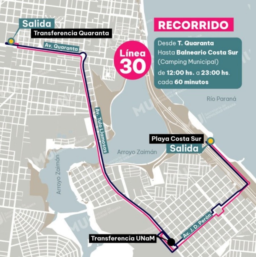 Desde la Municipalidad de la ciudad misionera de Posadas a través de la Secretaría de Movilidad Urbana informan los nuevos cambios en el recorrido de los colectivos de la Línea 30 Ramal Balneario Costa Sur.