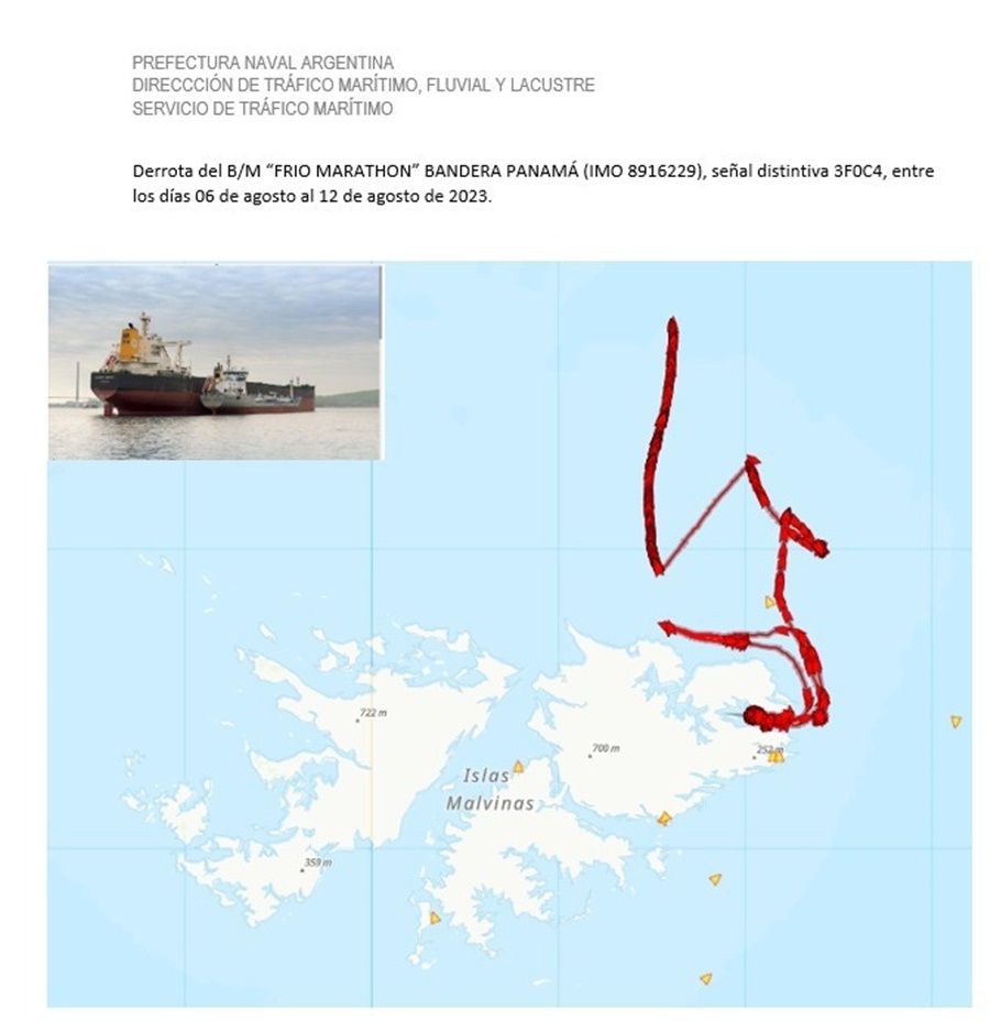 Prefectura Naval Argentina inició actuaciones sumariales al buque de carga panameño “FRIO MARATHON” (IMO 8916229) por haber operado en las Islas Malvinas sin autorización del Estado Argentino