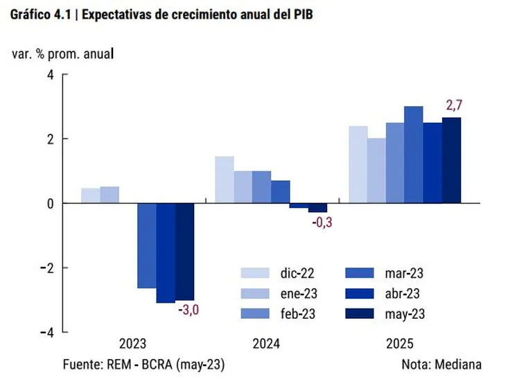En tanto, para 2024, los analistas esperan una baja anual del PBI de 0,3%, lo que implica una mayor caída del PIB en 0,1 p.p. respecto de la encuesta anterior. Para 2025, los participantes de la encuesta indicaron que proyectan un crecimiento de 2,7% del PBI real (+0,2 p.p. en relación con la encuesta previa).