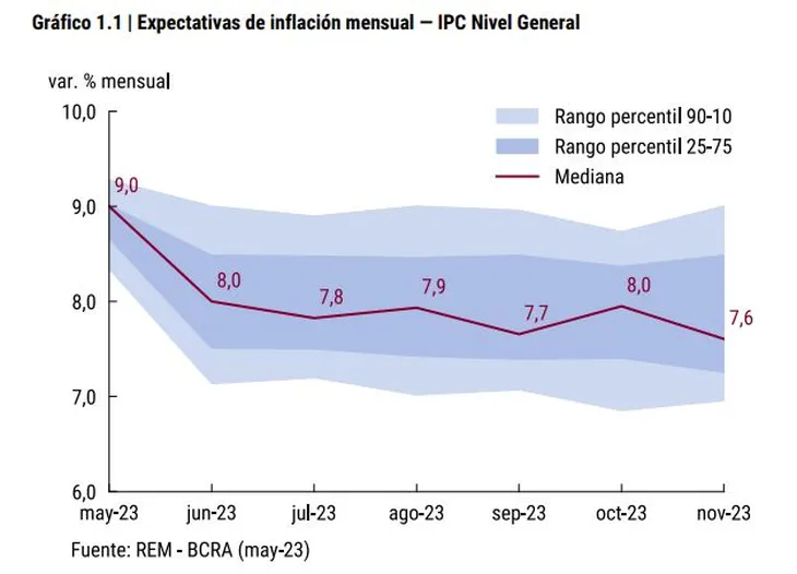 "Luego de que los participantes del REM brindaran sus pronósticos al BCRA, se conoció nueva información que sugiere que la inflación mensual se moderó con respecto al 8,4% observado en abril. Tanto los diversos indicadores de alta frecuencia de precios mayoristas y minoristas monitoreados por el BCRA como el IPC de la Ciudad Autónoma de Buenos Aires (CABA) sugieren una evolución más contenida que en el mes previo", señalaron desde el BCRA.