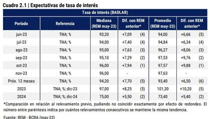 Quienes participan del REM prevén que la tasa de interés nominal anual (TNA) correspondiente a depósitos a plazo fijo de 30 a 35 días de plazo en bancos privados, de más de un millón de pesos, BADLAR promedio de días hábiles de mayo (90,05%) aumentará 3,15 p.p. en Junio (93,20%).