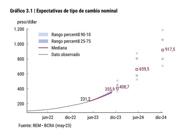El tipo de cambio nominal mayorista promedio mensual de días hábiles se ubicó en $231,19 por dólar en mayo de 2023. El pronóstico de quienes responden el REM indica una suba mensual de $16,92 (+7,3% mensual) por dólar, hasta $248,11 por dólar en Junio.