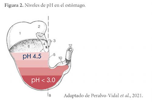Los cerdos, ya sean de producción convencional o en estado salvaje, se encuentran expuestos a distintos patrones de alimentación y recursos de alimento, que les permiten generar capas de pH en el estómago. Mientras más grande es el tamaño de partícula, más consolidada estará dicha capa. En la capa inferior, el pH es más bajo y aumenta ligeramente a medida que se avanza a las capas superiores del estómago.
