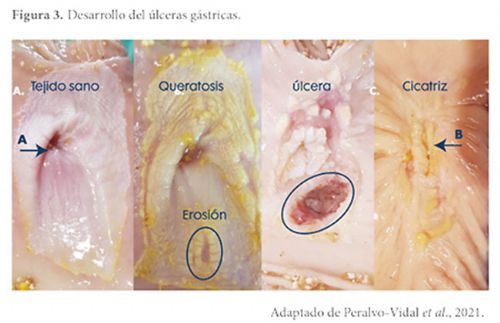 Las cuatro imágenes anteriores del par oesophagus (Figura 3) muestran las etapas del desarrollo de las úlceras gástricas: