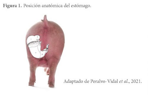 Para explicar lo que son las úlceras gástricas es importante entender cómo el estómago se encuentra anatómicamente posicionado en el cerdo. Las úlceras gástricas se dan en el Pars Oesophagea (su nombre en latín), la zona superior del estómago etiquetada como 4 en la figura 1, una zona con un tipo de tejido (epitelio escamoso estratificado) distinto al del resto del estómago, ya que es incapaz de secretar moco. De esta forma, esta zona no está protegida contra la acidez y las enzimas presentes en el contenido gástrico.