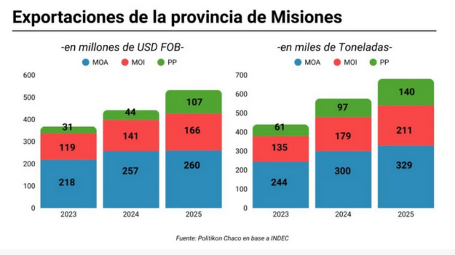 En cuanto a volúmenes físicos, la provincia de Misiones también lideró en el NEA al exportar 679.995 toneladas, lo que equivale al 35% del total regional. Este volumen representa el mayor registro desde el año 2010 y refleja un crecimiento del 18% con respecto a 2024, con alzas en todos los grandes rubros.