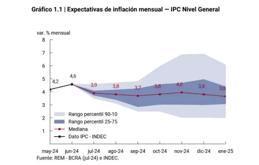 En el informe del REM, el BCRA agregó: "Quienes mejor pronosticaron esa variable en el pasado (Top 10) esperaban una inflación de 3,9% para Julio, de 3,6% para Agosto y de 122,2% interanual para 2024 (14,4 puntos menos que en el REM previo). Respecto del IPC Núcleo, el conjunto de participantes del REM ubicó sus previsiones para Julio en 3,6% y para Agosto en 3,4%. El Top 10 esperaba una inflación núcleo de 3,5% para Julio, de 3,0% para Agosto, y de 107% interanual para 2024 (-7,8 puntos respecto del REM previo)".