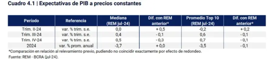 "La caída se habría concentrado en el primer semestre. De acuerdo con los pronósticos recibidos, el nivel de actividad comenzaría a recuperarse en el tercer trimestre del año, con una suba de 0,4% sin estacionalidad. Para 2025, el conjunto de participantes del REM estimó un crecimiento promedio de 3,2% interanual", consignó el BCRA.