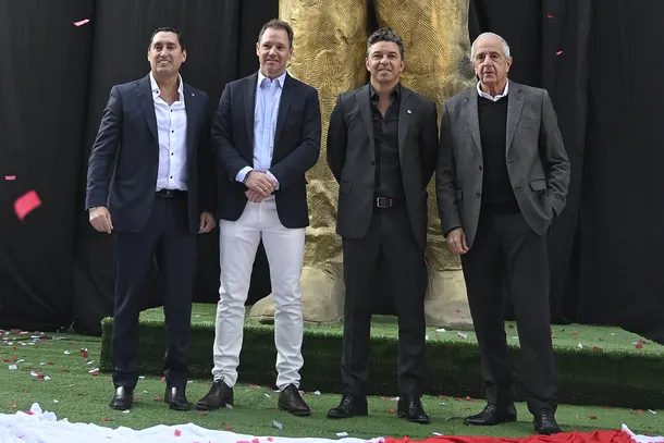 Al escenario subió el manager del club Enzo Francescoli, y los ayudantes de Gallardo, Matías Biscay y Hernán Buján, además del extitular del club, Rodolfo D’Onofrio.