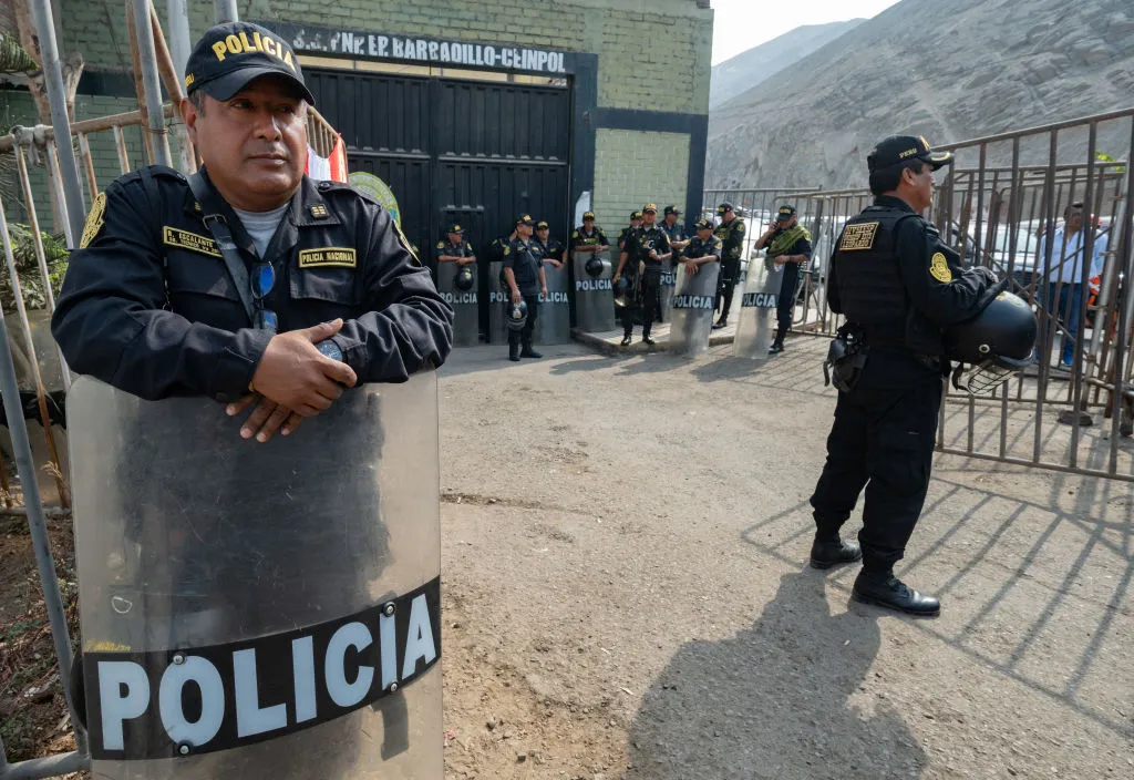 Policías custodian la entrada de la prisión de Barbadillo, donde se encuentra detenido el expresidente de Perú Alberto Fujimori, en las afueras del este de Lima el 6 de Diciembre de 2023. (Crédito: CRIS BOURONCLE/AFP via Getty Images)