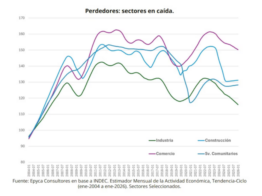 “De esta forma, vemos que en enero los sectores ganadores cayeron, pero se mantienen 15,3% arriba respecto al nivel de noviembre de 2023, mientras que los perdedores tuvieron una mejora, pero continúan 4,9% por debajo del nivel del inicio del Gobierno, y se encuentran estancados desde Junio de 2025″, destacaron.