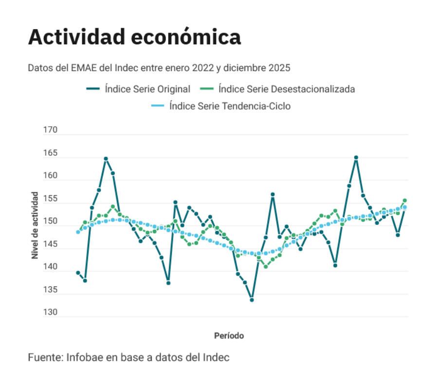 El economista Marcos Cohen Arazi, de Fundación Mediterránea-Ieral, estimó que el nivel de actividad se ubica 6,4% por encima de noviembre de 2023, mes previo al inicio de la presidencia de Javier Milei, lo que refleja un “desempeño destacado”. A la vez, en los últimos 12 meses, el crecimiento calculado es de 1,9 por ciento.