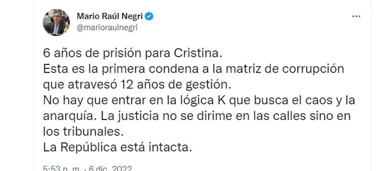 “6 años de prisión para Cristina. Esta es la primera condena a la matriz de corrupción que atravesó 12 años de gestión. No hay que entrar en la lógica K que busca el caos y la anarquía. La justicia no se dirime en las calles sino en los tribunales. La República está intacta. Es importante que la sociedad entienda que esta sentencia no está firme. Queda mucho camino por recorrer, por eso es falso el relato K que habla de una proscripción de la Vicepresidenta. Argentina será más justa cuando los corruptos teman a la Ley”, agregó Mario Negri, presidente del bloque de la UCR en la Cámara de Diputados.