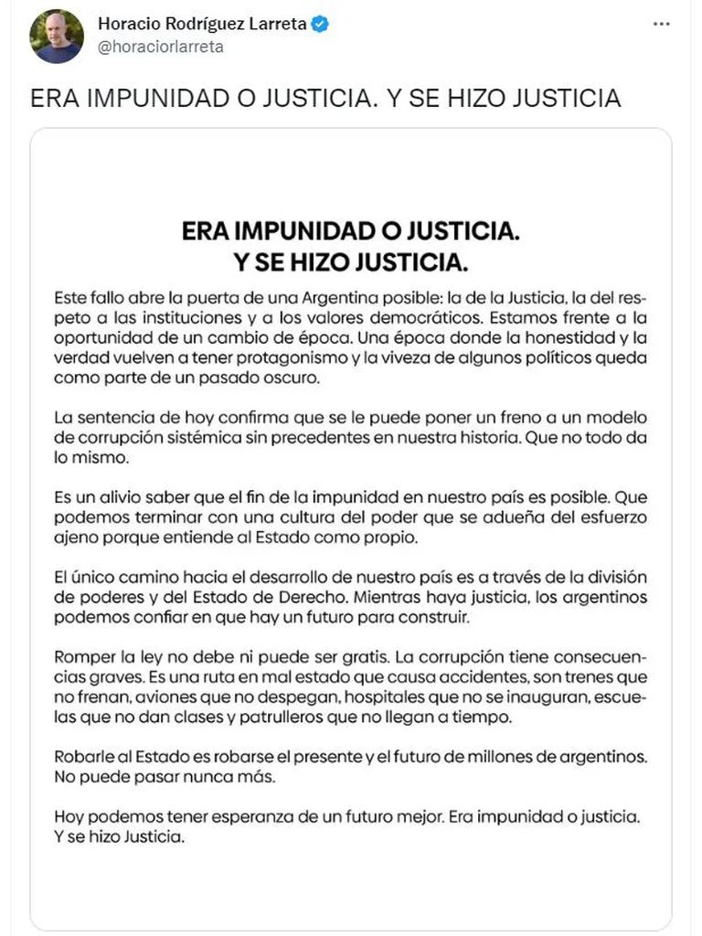 En su cuenta de Twitter, Horacio Rodríguez Larreta compartió un comunicado titulado “Era impunidad o justicia y se hizo justicia”. Allí sostuvo que el fallo “abre la puerta de una Argentina posible: la de la Justicia, la del respeto a las instituciones y a los valores democráticos. Estamos frente a la oportunidad de un cambio de época. Una época donde la honestidad y la verdad vuelven a tener protagonismo y la viveza de algunos políticos queda como parte de un pasado oscuro”.