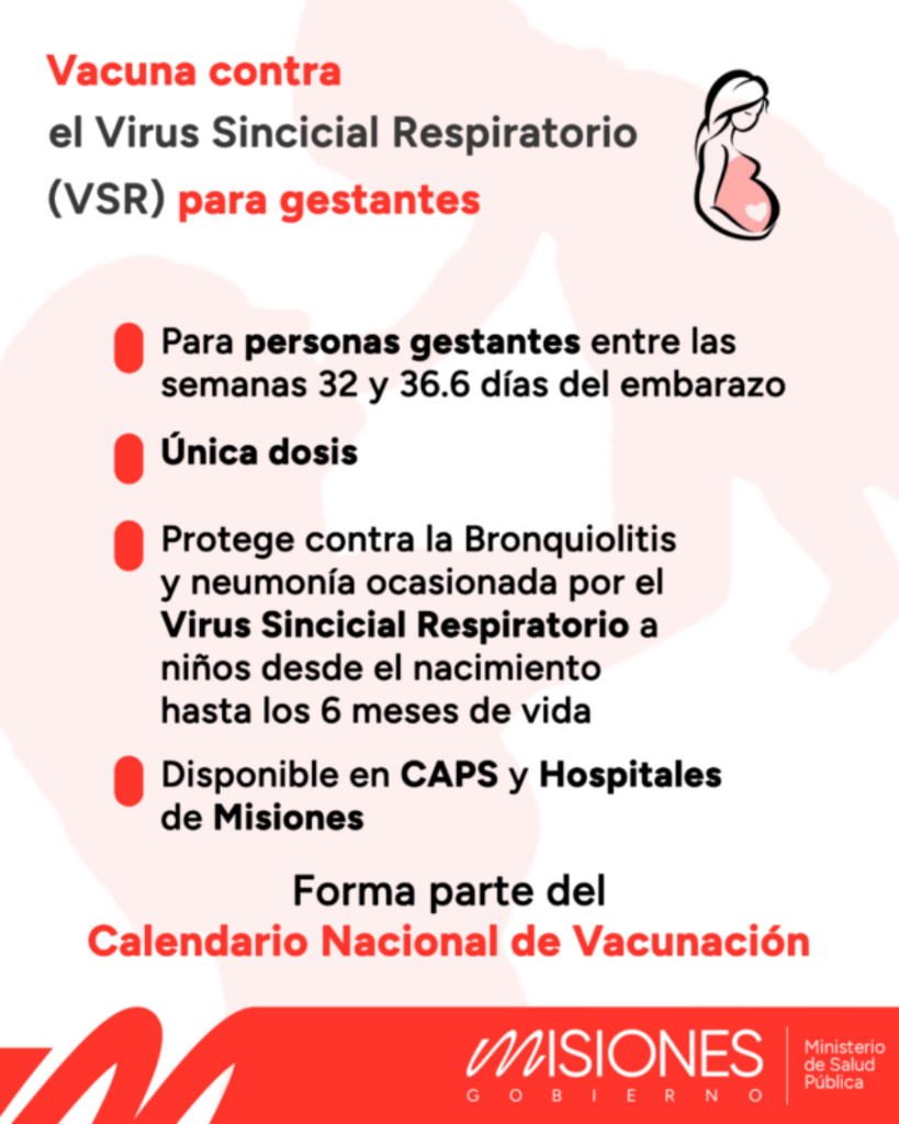 Desde el 2 de Enero de 2025 estarán disponibles las vacunas contra el Virus Sincicial Respiratorio (VSR) para personas gestantes en los Centros de Atención Primaria y Hospitales dependientes de Ministerio de Salud Pública de la provincia de Misiones.