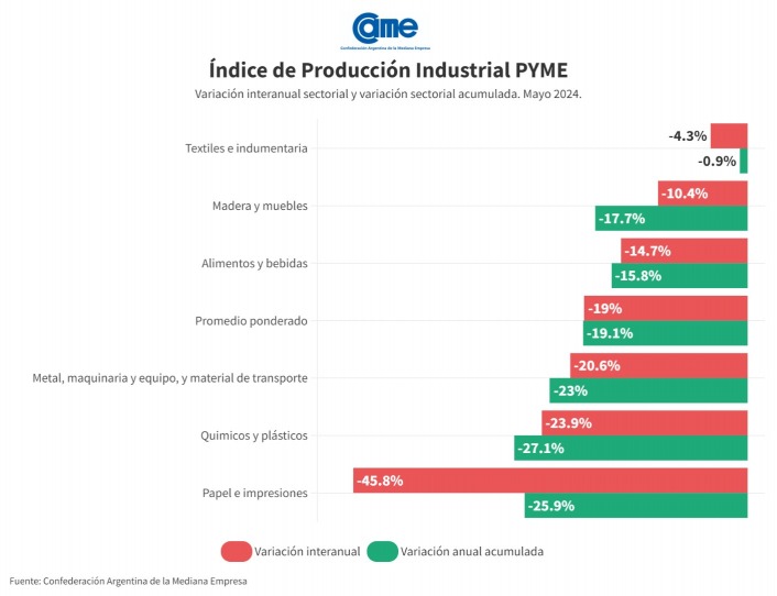 Los seis sectores manufactureros del segmento pyme tuvieron fuertes declives en la comparación anual, siendo los más afectados “Papel e Impresiones” (-45,8%) y “Químicos y plásticos” (-23,9%). “Textil e indumentaria”, que venía siendo casi el único ramo en aumento hasta Abril, se retrajo 4,3% anual en Mayo.