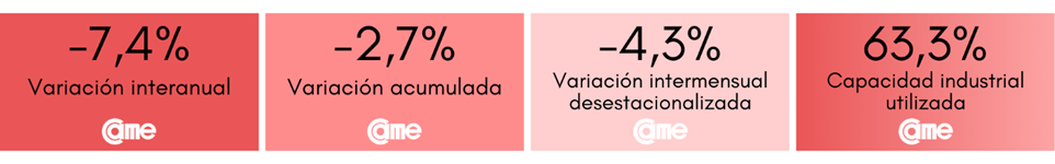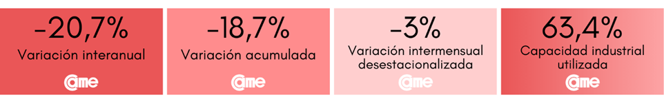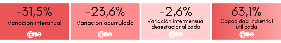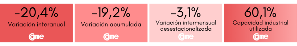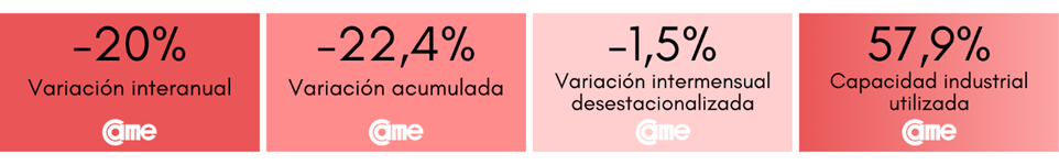 El sector tuvo una contracción anual de 20% en Junio, a precios constantes, y de -1,5% en la comparación mensual. Para el primer semestre del año, acumula una caída de 22,4% frente a los mismos meses de 2023. Las industrias operaron al 57,9% de su capacidad instalada, cuando en mayo ese nivel era de 66,6%, mostrando una acentuada caída.