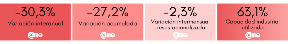 El sector registró una caída de 17,4% anual a precios constantes en Junio y de -4,8% en la comparación mensual. Para el primer semestre del año acumula una baja de 16,7% anual. Las industrias operaron con apenas 58,1% de su capacidad instalada en el sexto mes del año (72,4% en mayo), niveles muy bajos para lo habitual del sector.