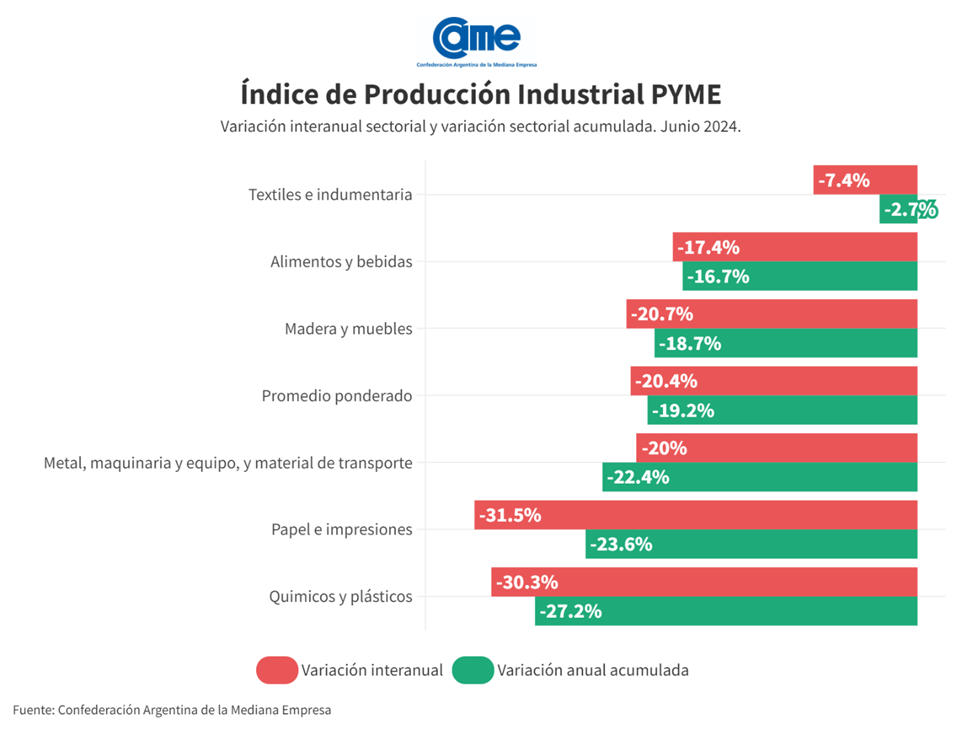La actividad manufacturera de las pymes disminuyó 20,4% anual en Junio y acumula una retracción de 19,2% en el primer semestre del año frente al mismo período de 2023. En tanto, en la comparación mensual desestacionalizada, la actividad también declinó 3,1%.