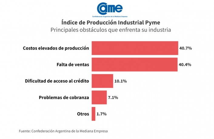 Asimismo, los principales desafíos identificados por los empresarios en la encuesta fueron los altos costos de producción y logística (40,7% de las respuestas) y la falta de ventas (40,4%). Los dos factores se presentan como los obstáculos más significativos para el crecimiento y la estabilidad de las pymes. Si bien el segundo factor comentado ocupó el primer lugar el mes anterior, el mismo aumentó en 0,9 puntos porcentuales.