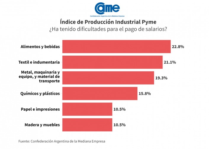 Por último, en diferentes sectores industriales se consultó si la PyME tuvo dificultades para afrontar el pago de salarios del mes en curso. Allí, el 16,7% de las firmas presentaron problemas para pagar salarios (sin incluir aguinaldo u otros conceptos) unos 2,6 puntos porcentuales menos que el mes pasado. Los sectores más afectados fueron “Alimentos y bebidas” y “Textil e indumentaria” con tasas de dificultades del orden del 22,8% y 21,1%, respectivamente.