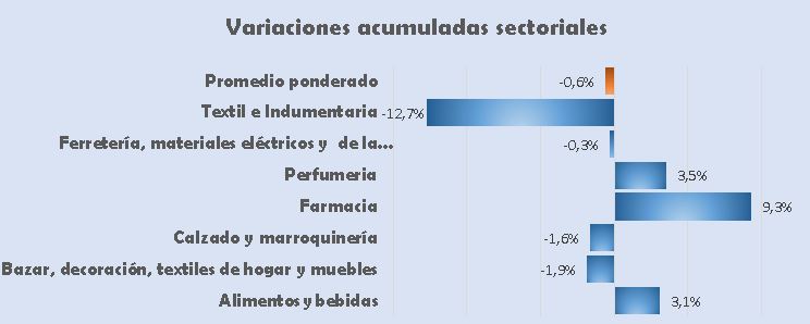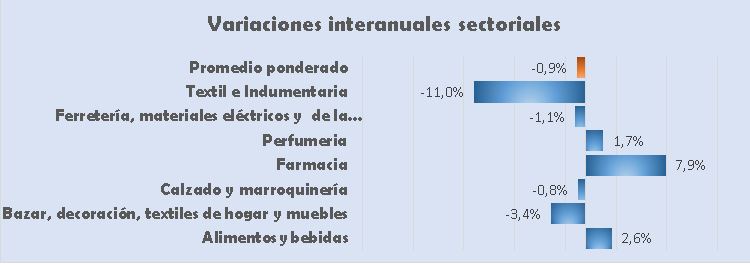 En cambio, se retrajeron Textil e Indumentaria (-11%), Bazar, decoración, textiles del hogar y muebles (-3,4%), Ferretería, materiales eléctricos y materiales de la construcción (-1,1%) y calzados y marroquinería (-0,8%).