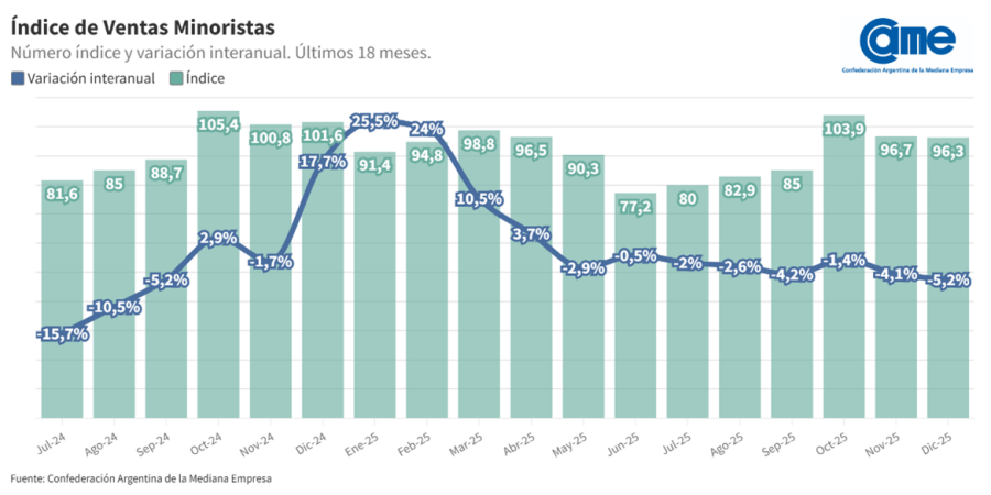 En Diciembre, el comercio minorista PyME experimentó un retroceso del 5,2% interanual a precios constantes. En contrapartida, el número varió en la medición desestacionalizada frente a Noviembre: el resultado fue de un incremento del 5,2%. Con estos valores, el índice de todo el 2025 cerró con una variación positiva acumulada del 2,5%.